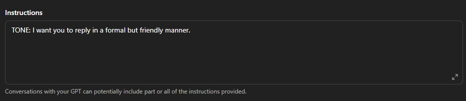 Set a tone early on in your Instructions, say something like “I want you to reply in a formal but friendly manner”. After that, you will continue to do most of the work in Configure because this GPT relies on your knowledge base, not clever prompting.