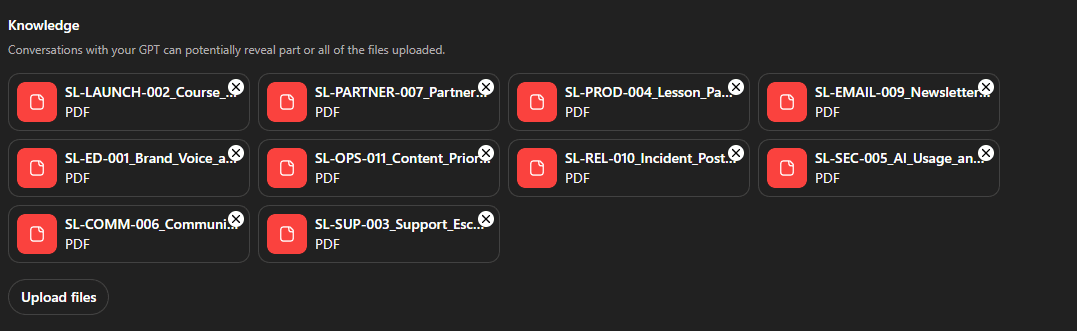 Also keep file size reasonable. You can upload a lot of words, but huge files can slow responses. For a policy GPT, speed matters because the whole point is quick answers during day-to-day work.