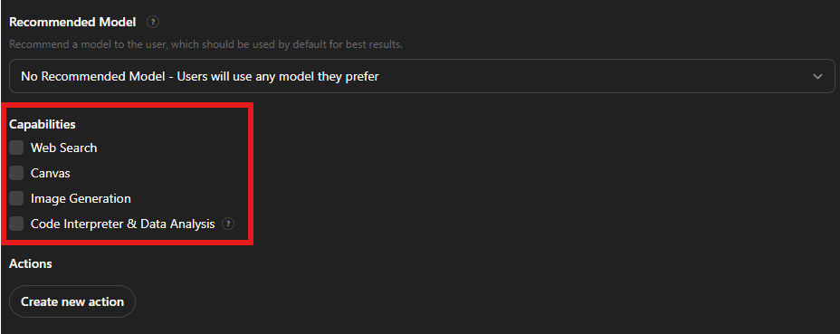 Disable image generation and anything built for analysis workflows. For a policy assistant that’s answering from text documents, you don’t need extra tools turned on. Keeping this minimal helps avoid weird behavior and keeps responses snappy.