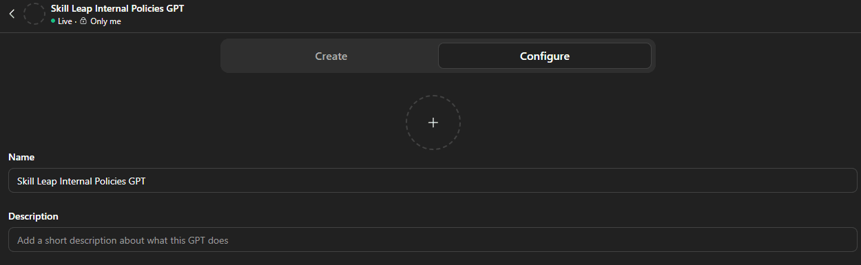 Create your new GPT and skip straight to the Configure tab and type your name there. We went with something easy like Skill Leap Internal Policies GPT, so we recommend something similar. This keeps the build fast and focused.