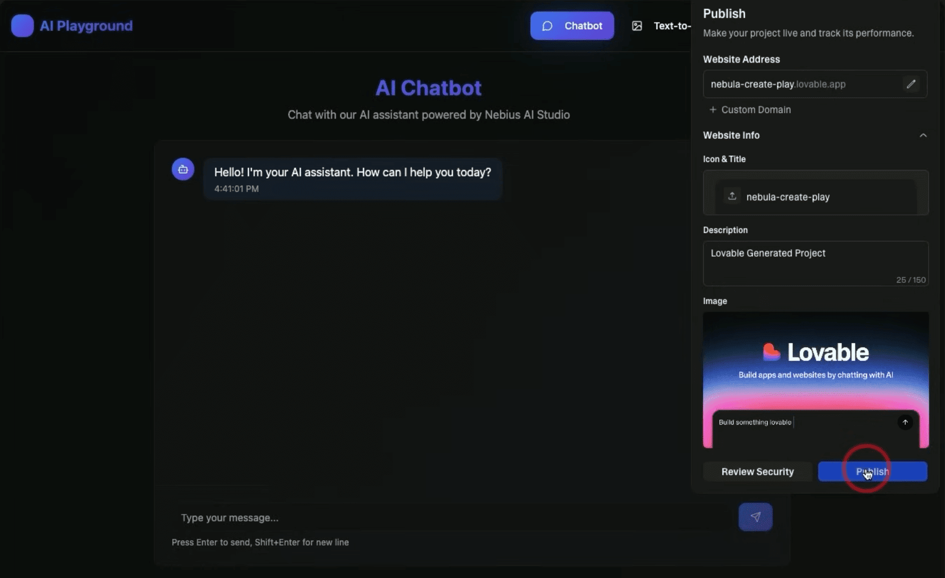 Ask Lovable to add a âNew Chatâ button so users can reset conversations without refreshing the page. Add a one-click light mode toggle so people can choose a theme. Then use the âReview securityâ option before publishing. Fix any issues it flags, then publish to generate a shareable link