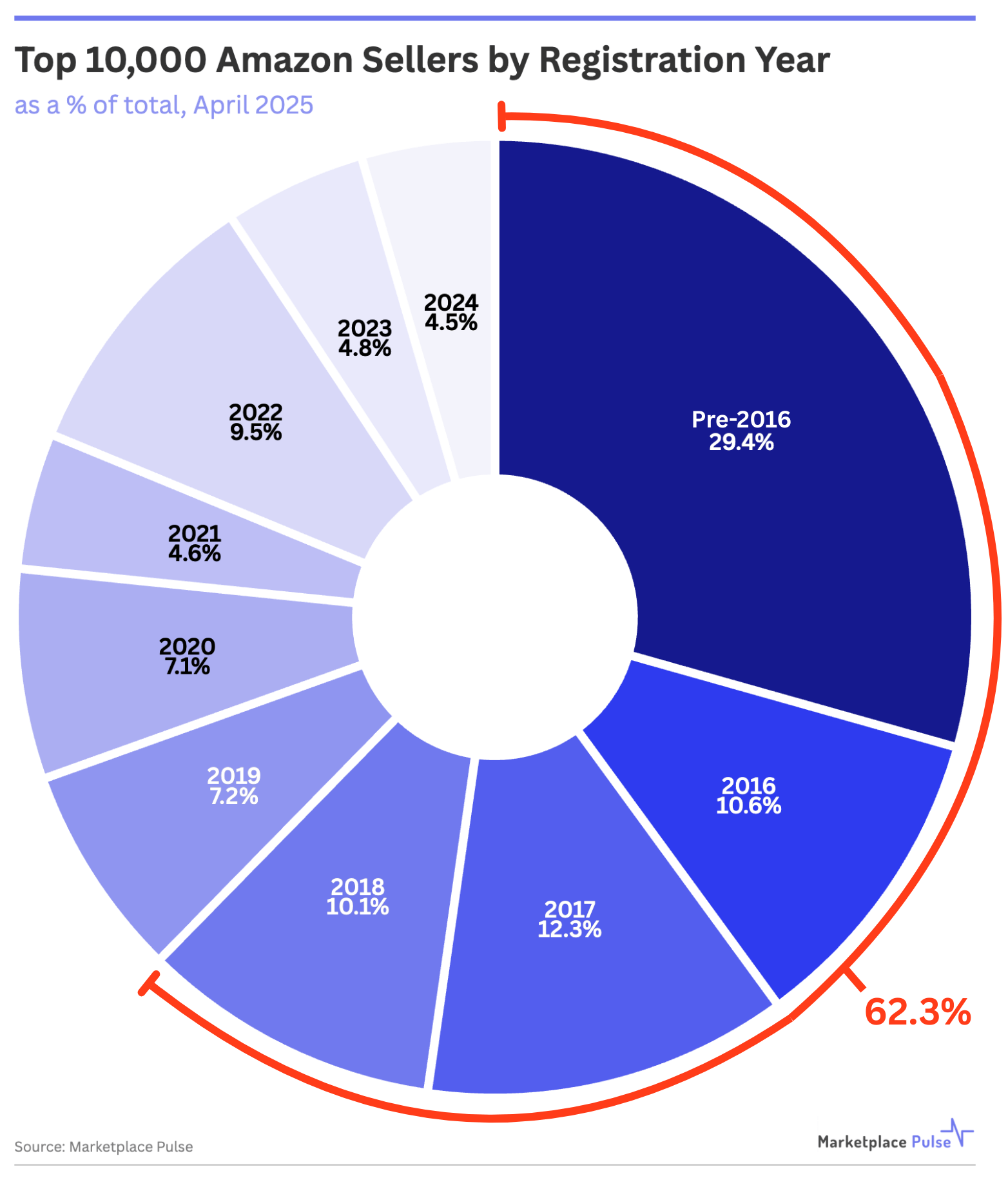 Sellers who got in early and built for the long haul. More than 60% of the top 10,000 sellers joined before 2019.