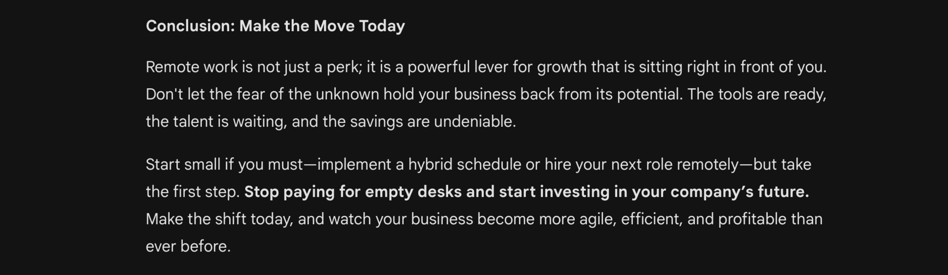 Gemini delivered a clearer, more motivating conclusion that was ready to publish. This back and forth made the final version sharper and more engaging.