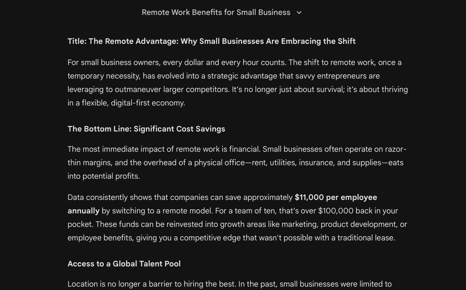 Gemini responded with a well structured article, complete with a title and logical sections. We scanned it for accuracy, tone, and structure, and made sure it matched our brand. That first review took less than a minute and already replaced an entire draft-writing session.