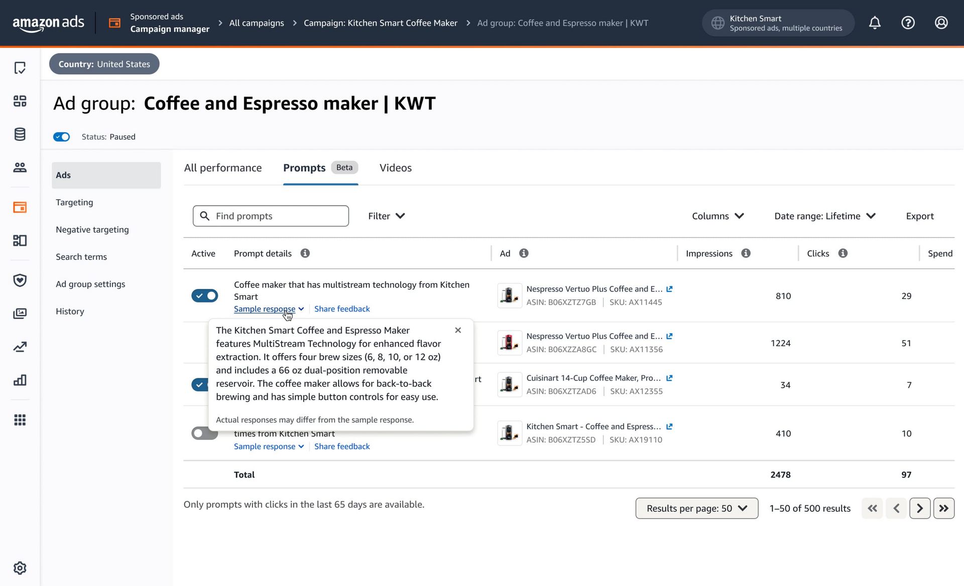 These are interactive, AI-powered prompts that get layered onto your existing Sponsored Products and Sponsored Brands campaigns. They pull from your detail page, Brand Store, campaign data, and more to show up when shoppers are looking for answers, acting almost like a 24/7 product expert.